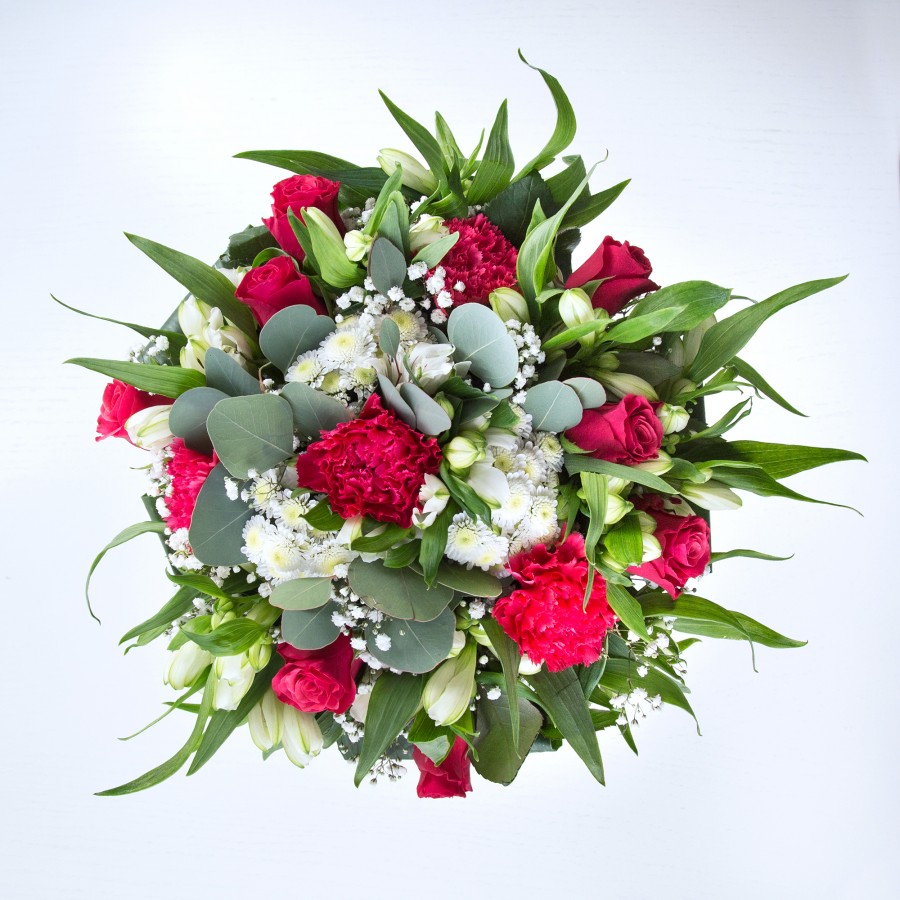 This vibrant expression of love bouquet is a celebration of passion and beauty. Featuring an impressive ensemble of soft white chrysanthemums, delicate gypsophila, bold red roses, tender carnations, crisp white alstroemeria, and graceful aspidistra leaves, it brings a dynamic burst of color to any space. Every element is designed to evoke warmth and admiration.